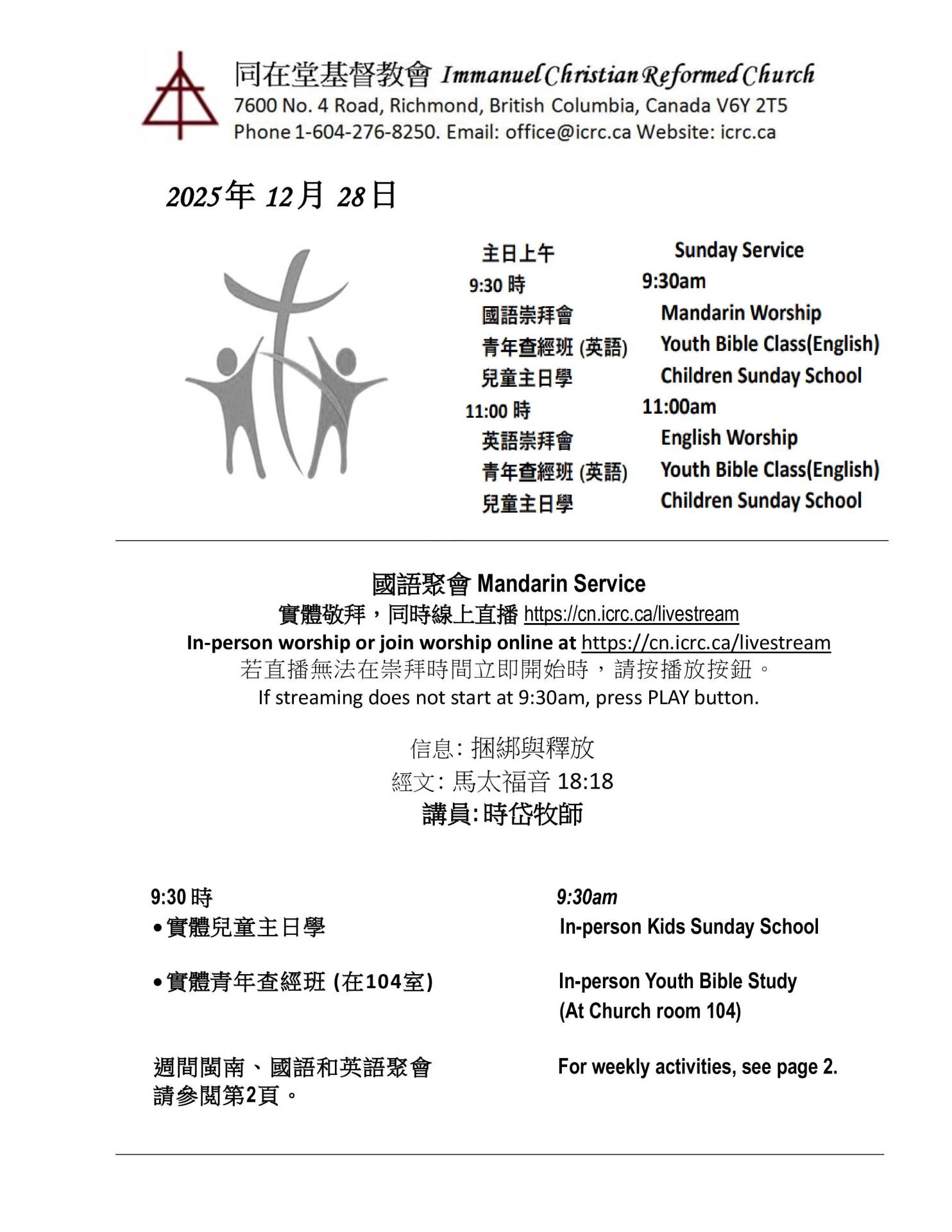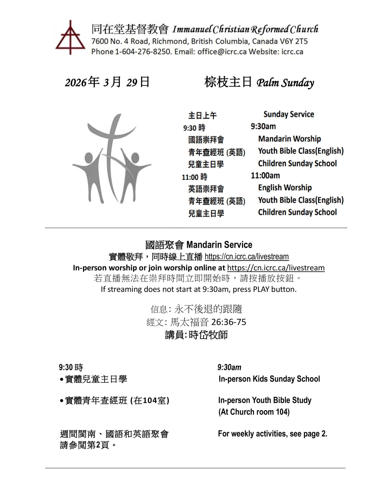 欢迎来到我们的周日崇拜直播!要观看我们的崇拜直播,请每周日上午9点30分回来参加我们的普通话崇拜。